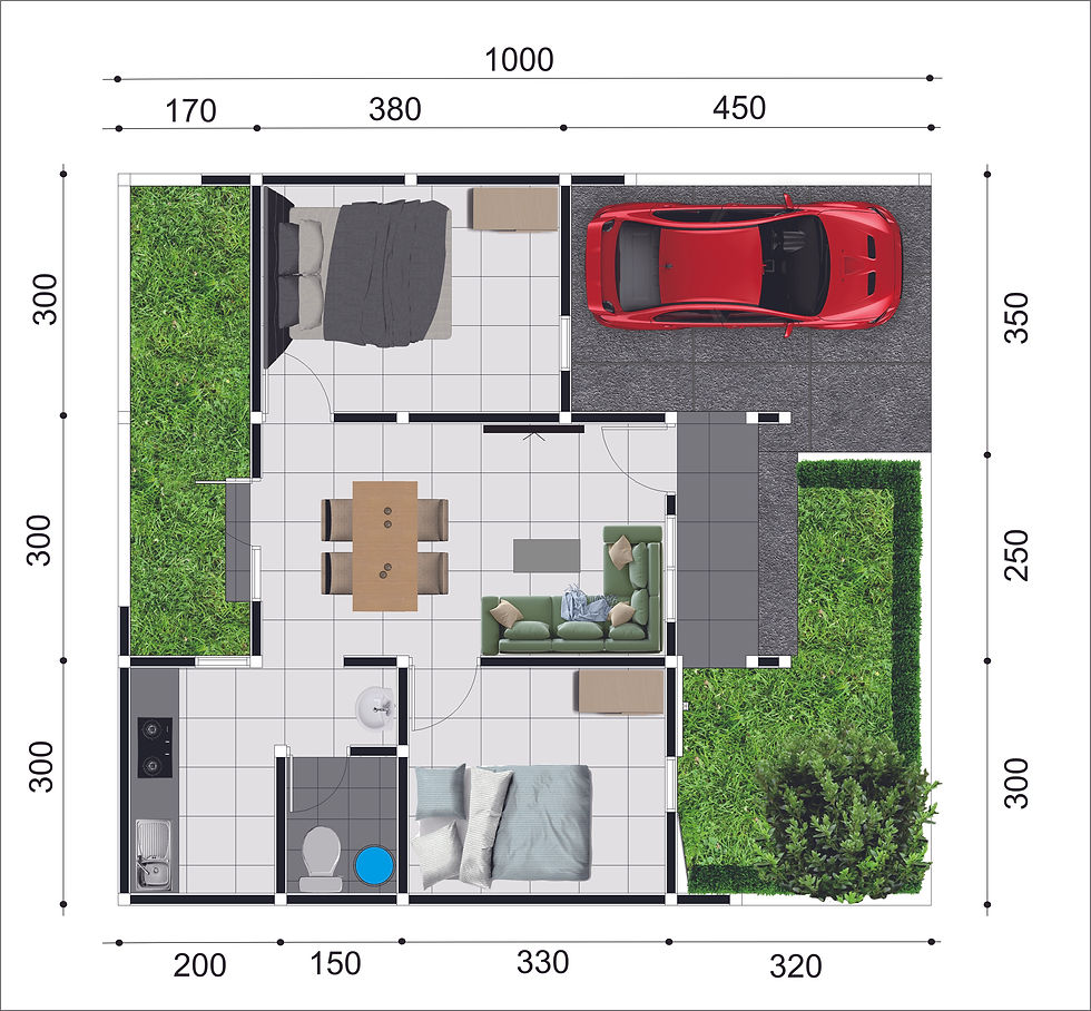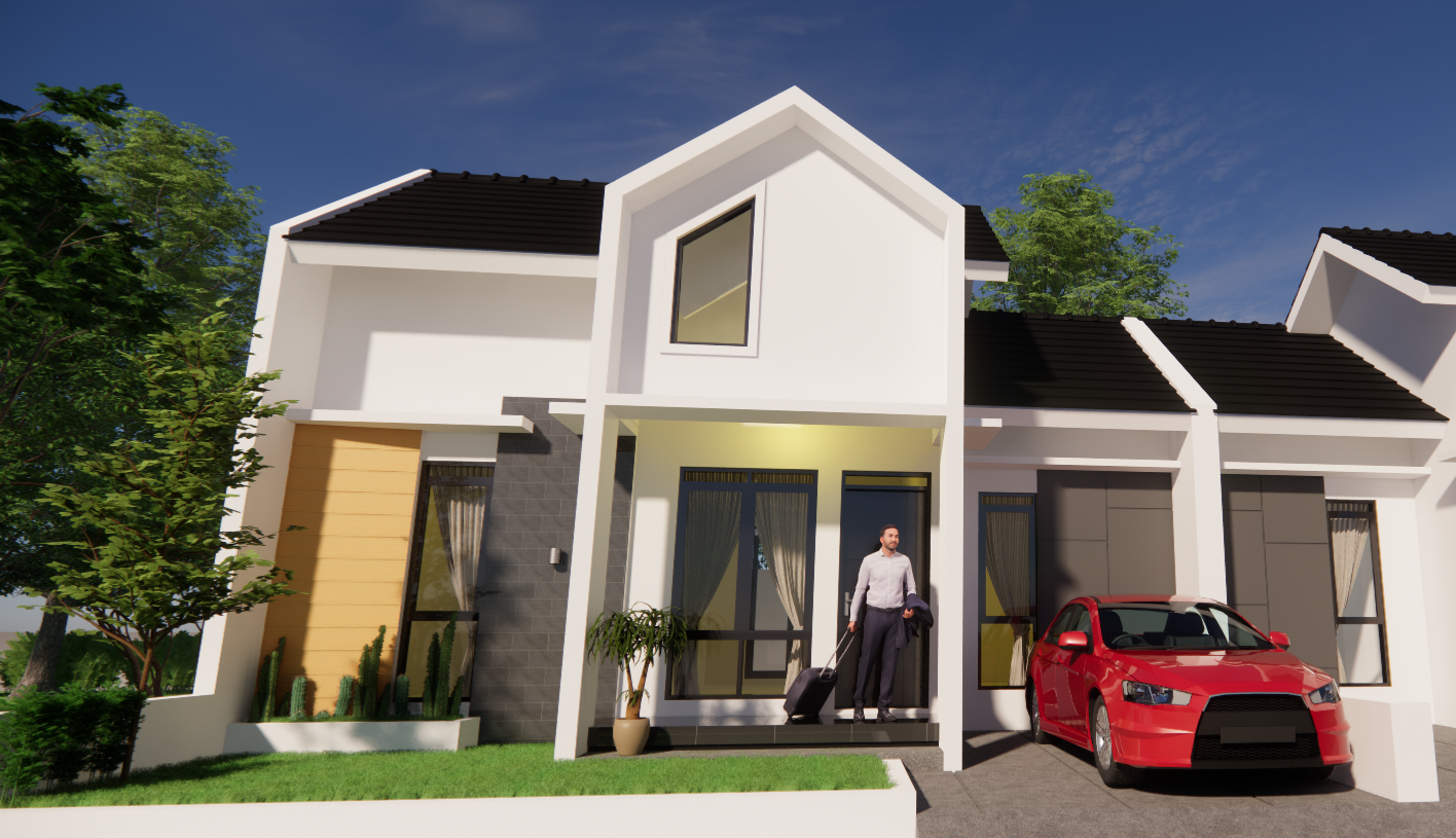 Desain untuk tipe ini memiliki 2 kamar tidur, 1 kamar mandi, dan garasi untuk 1 mobil